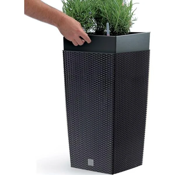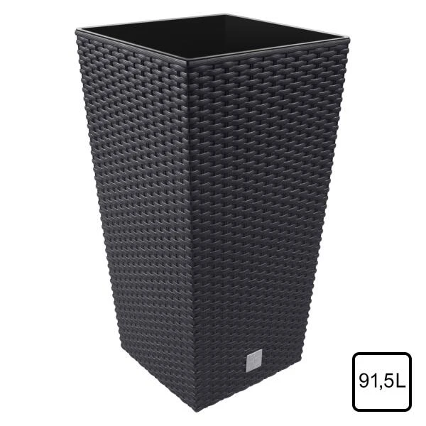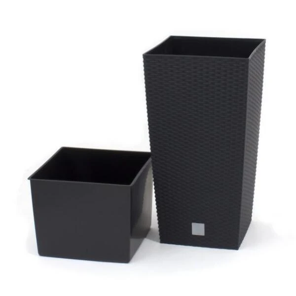 Een hoge vierkante bloempot met een leuke rattan look gemaakt uit robuuste kunststof.