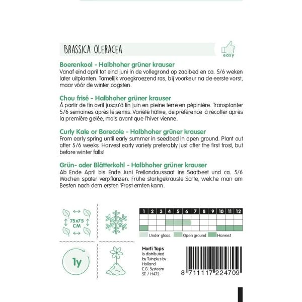 Dit tamelijk vroeg kroesend ras oogst je best na de eerste vorst maar zeker voor de winter. Plantafstand: 75 cm.