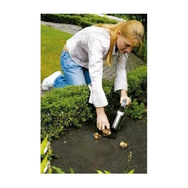 Steek de bloembollen in de bodem en door het handvat van de planter samen te knijpen valt de aarde die er nog insteekt boven op de net geplante bollen. Lekker handig dus.