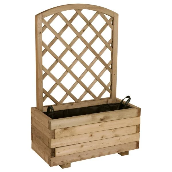 Klassieke houten plantenbak met een bijhorend houten klimrek in diagonale ruitvormen.