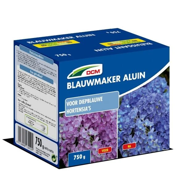 Donkerroze en roze hortensia’s verkleuren blauw tot dieppaars wanneer ze in een zure grond staan. Voor een optimale blauwkleuring aluin tweemaal per jaar toepassen, in het voorjaar en in het najaar. Los het aluin op in lauw water en giet de planten aan. Bij aanplanting in het voorjaar, mag de volledige dosis in één keer toegediend worden.
