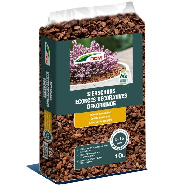 DCM Sierschors is een bruinrode schors die geschikt is als afdekmateriaal voor plantenschalen, bloembakken of potten. Een laagje voorkomt onkruidgroei en beschermt de bodem tegen sterke temperatuurschommelingen zowel in de zomer als in de winter.