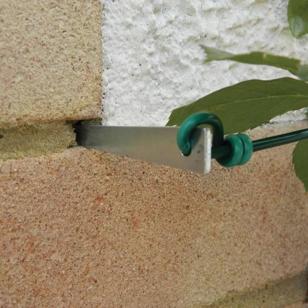 Deze handige geleiders kunnen in de voegen van een stenen muur of in houten palen worden aangebracht. Door het voorziene oogje kan de draad worden gespannen en vastgeknoopt.