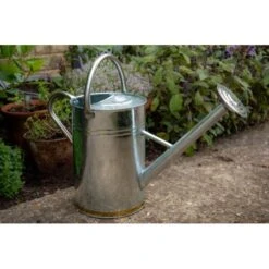 Deze mooie gieter heeft twee handgrepen, een vaste greep bovenop de vulopening en een greep aan de achterzijde. De gieter zelf is gemaakt uit gegalvaniseerd blinkend metaal en beide handgrepen alsook de bovenkant van de broes zijn koperkleurig. Hierdoor is de gieter niet alleen functioneel maar ook heel decoratief.