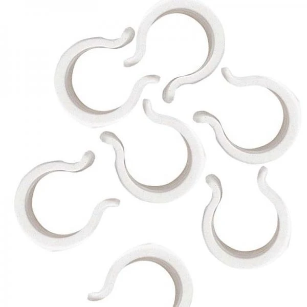 Stevige kunststof klemmen voor het vastzetten van folie, insectengaas, weringsnet of zeil aan buisvormige structuren.