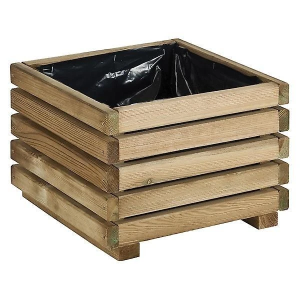Leuke vierkante plantenbak KUB in grenenhout die is samengesteld uit balkjes met een dikte van 25 mm. Deze plantenbak is geschikt voor planten met een maximale hoogte van ca. 70 cm en wordt geleverd met een beschermende plantendoek.