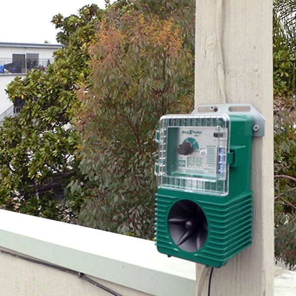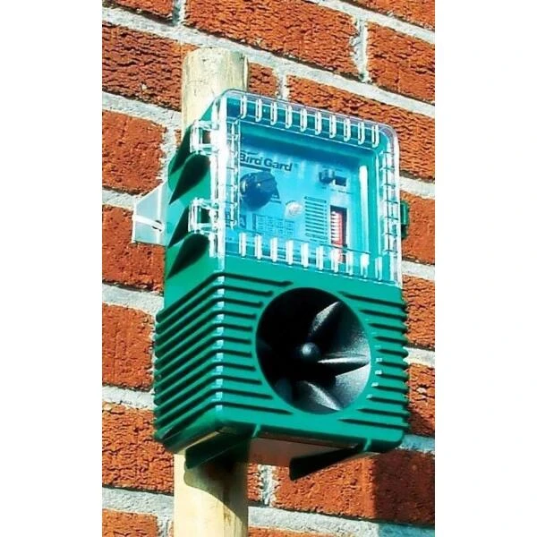 Deze professionele vogelverjager met een bereik tot 6000 m² maakt 8 verschillende geluiden van roofvogels en noodkreten van de te verjagen kraaien. Instelbaar in volume, lengte, soort vogel, tijdklok, willekeurig tijdstip (dag, nacht, 24 uur).