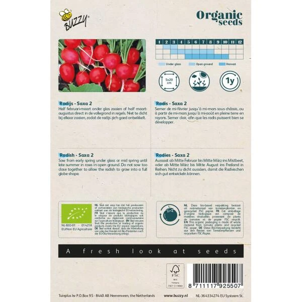 Kweek zelf radijzen op een biologische manier en start met biologische zaden. Radijs Saxa kan gezaaid worden vanaf half februari tot maart onder glas of vanaf half maart tot augustus direct in de volle grond. Zaai ze niet te dicht bij elkaar zodat de radijzen voldoende plaats hebben om zich te ontwikkelen.