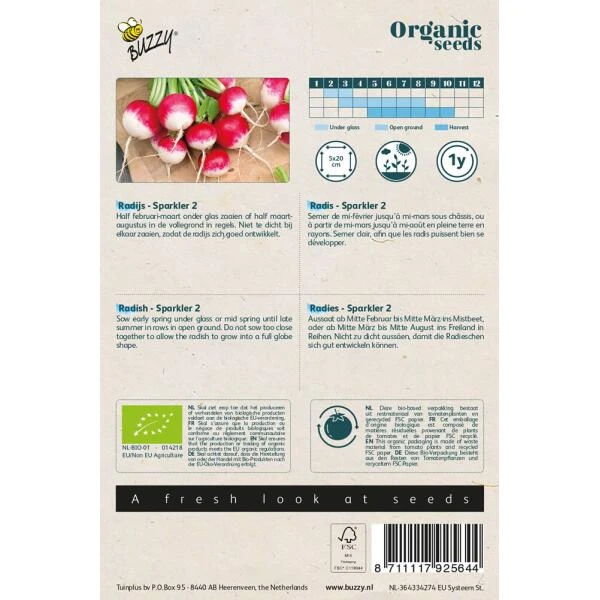 Kweek zelf radijzen op een biologische manier en start met biologische zaden. Radijs Sparkler kan gezaaid worden vanaf half februari tot maart onder glas of vanaf half maart tot augustus in regels in de volle grond. Zaai ze niet te dicht op elkaar zodat ze de kans hebben om voldoende te ontwikkelen.