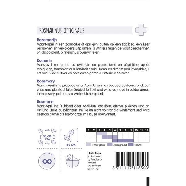 Rozemarijn is vorstgevoelig en moet dus tijdig worden beschermd. Kalkrijke grond en een zonnige, beschutte standplaats geven de beste resultaten. Op kalkgrond blijft de rozemarijn wel iets kleiner maar geeft meer geur af. Het is een langzame, groenblijvende groeier. Oude planten mogen niet te sterk worden teruggesnoeid. De beste zaaitijd is in maart – april in een zaaibakje onder glas of eind april- juni buiten op een zaaibed. De ontkieming kan onregelmatig zijn. Dek het zaaibakje af met huishoudfolie en plaats het op een lichte, warme plaats. Als er na 5-6 weken groene scheutjes verschijnen moet de folie worden verwijderd. Een keer verspenen en vervolgens buiten of in een flinke pot uitplanten. Plantafstand in de tuin is 30 x 30 cm. ’s Winters tegen de vorst beschermen of (als kamerplant) binnenshuis laten overwinteren.