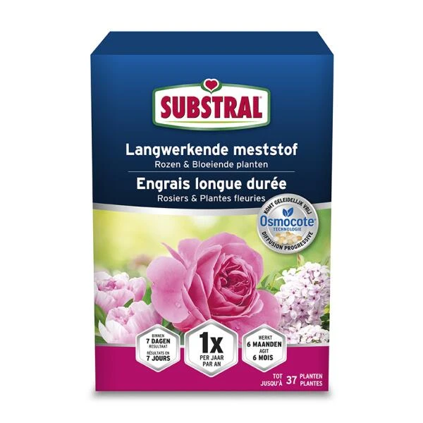 Deze universele meststof van Substral is ideaal voor rozen en bloeiende planten. Osmocote werd speciaal ontwikkeld voor alle soorten rozen; bloeiende struiken zoals Gelderse roos, bruidsbloem, Oleander,… en bloemen in volle grond maar ook in bakken en bloempotten.