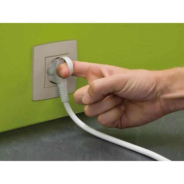 Dankzij de platte stekker is het verlengsnoer ideaal voor een stopcontact achter een meubel. Gemakkelijk uit te trekken dankzij de soepele kunststoffen ring.