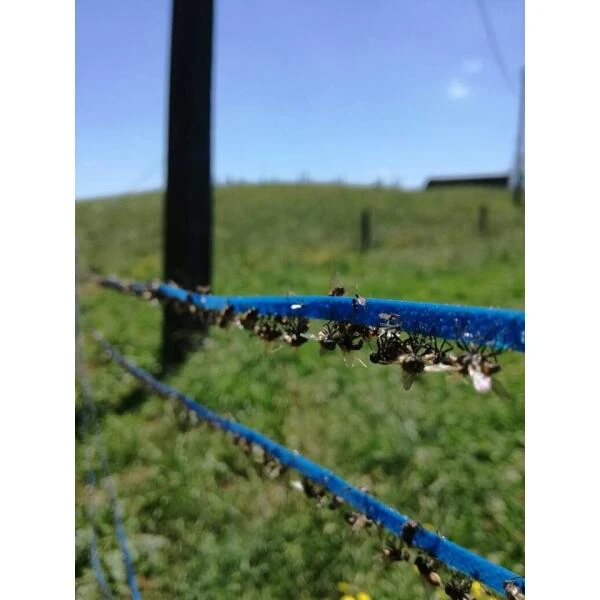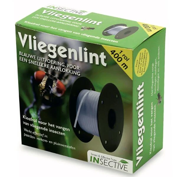 Gifvrij vliegenlint voor het vangen van vliegen in stallen, melklokalen, schuren,… Deze rol heeft een blauw lint om meer aantrekkingskracht uit te oefenen op vliegen.